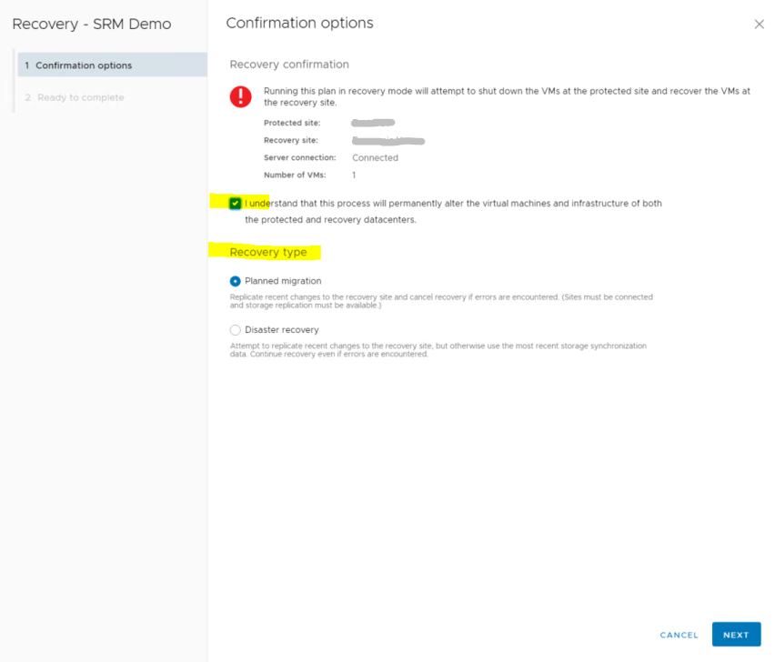 Select if this is a planned Failover or Disaster Recovery and confirm settings