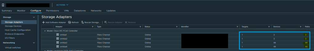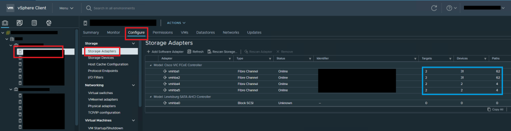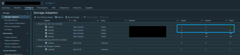 Here are two hosts with the issue. You’ll see only one Target for the affected vmhba’s and reduced paths:-