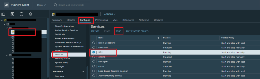 Now the storage paths are back to normal, remember to Stop the SSH service on the host you’ve been working with by selecting the host > Configure > Services > Select SSH > Select Stop