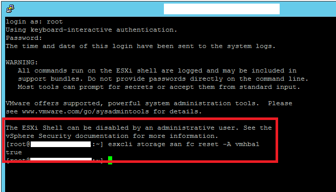 Run this command: esxcli storage san fc reset -A vmhbaX. X represents which vmhba you want to reset. In the example below, I’m resetting vmhba1.
