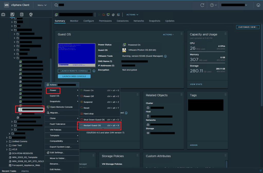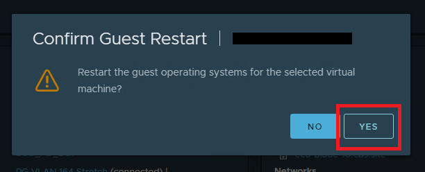 In the vSphere Client, Navigate to the Node which will have the root password reset > Right Click > Power > Restart Guest OS