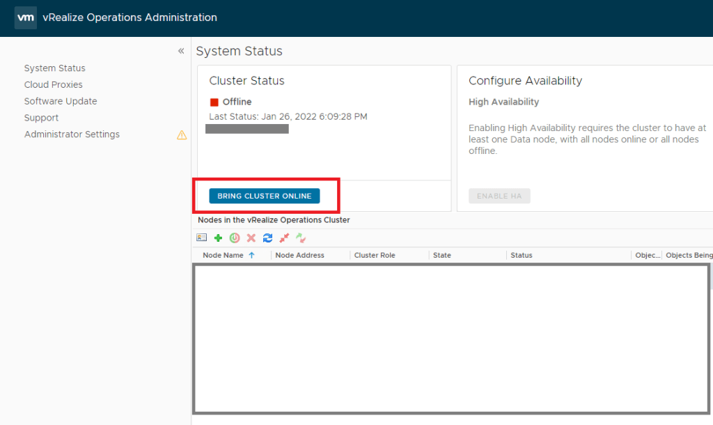 Under System Status > bring the cluster back online by clicking Bring Cluster Online > Monitor until all Nodes and the cluster is Online