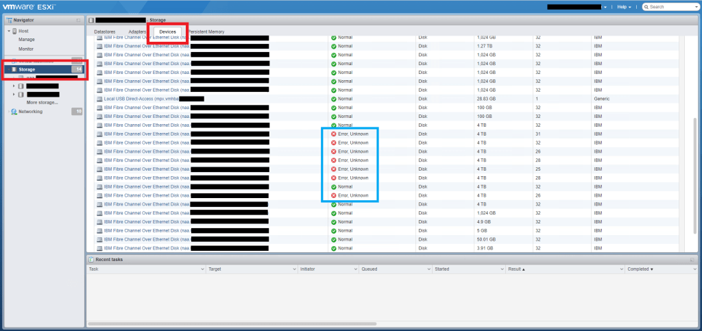 I hoped readding the host mappings which were incorrectly removed from the IBM SVC GUI would present the datastores back to the hosts exactly as they were before the mappings were removed but unfortunately it wasn’t the case and at first glance, gave some inconsistent results as different hosts could access different datastores. This is one of our smaller environments in the process of being decommissioned so I was able to quickly work through some troubleshooting and reconfiguration in an attempt to get the datastores available.