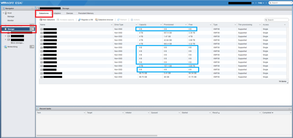 Once the rescan had completed, I could see the Devices show as Normal instantly but the Datastores took a couple of minutes to return as expected with capacity and details present