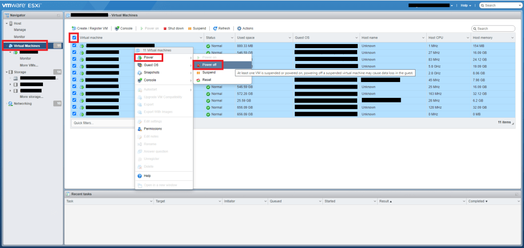 I’d noted which servers were showing as a Powered On state before troubleshooting so powered off all VMs by Selecting all VMs > Right Click > Power > Power Off