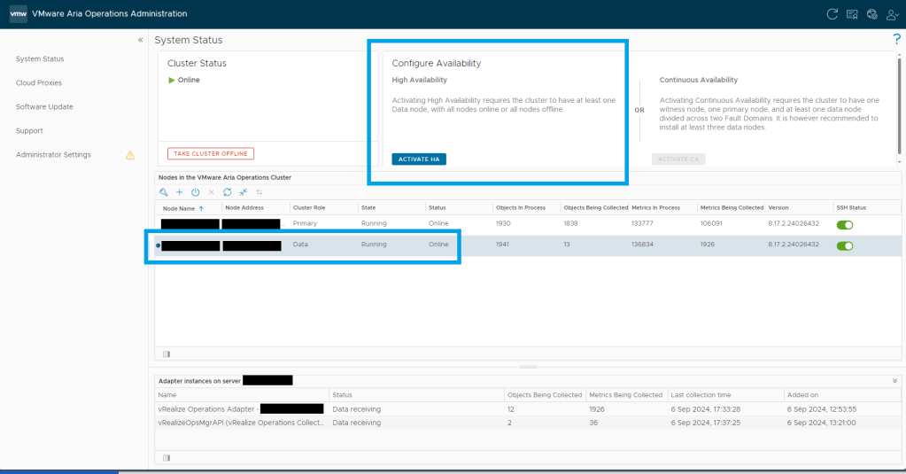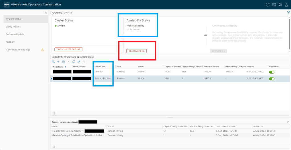 Log in to an Aria Operations Node web admin interface > Note the High Availability is Activated with a green check mark and there is a Primary Replica Cluster Node > Click Deactivate HA