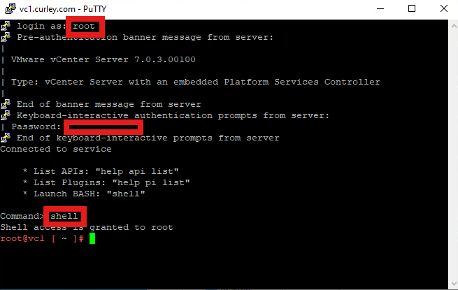 Open Putty > enter the vCenter name or IP address > Click Open