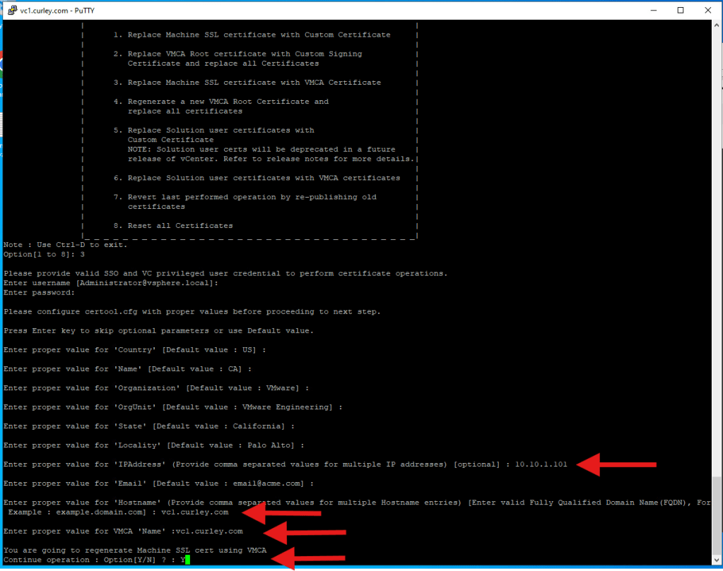Enter your desired information for each section > hit Return until all info in entered and you’ll be informed this action will generate Machine SSL cert using VMCA > Type Y to confirm > hit Return to begin the process